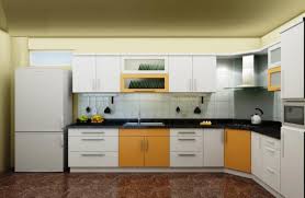 Cánh tủ bếp cả trên và dưới đều được sơn phủ màu sắc nổi bật với màu vàng cam và màu trắng thông dụng, ốp đá bếp màu đen tạo sự chắc chắn và kính màu trắng tạo sự tươi mới.