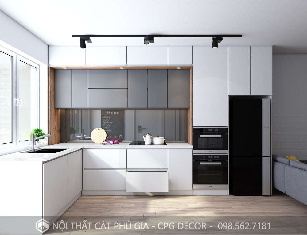 Tủ bếp nhựa Picomat – TBP03 với thiết kế chữ L nhỏ gọn, nhưng vẫn đầy đủ công năng, tiện nghi. Khu vực tủ lạnh và lò nướng vẫn được bố trí vừa vặn, không có cảm giác chật chội. Phía trên là hệ tủ bếp khá lớn, tận dụng tối đa không gian phía trên, có thể chứa khá nhiều đồ dùng nhà bếp. TBP03 được đặt bên cạnh một khung cửa sổ đón ánh mặt trời, không gian trở nên sáng bừng, tận dụng ánh sáng tự nhiên.